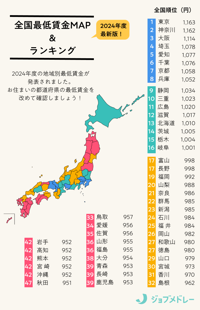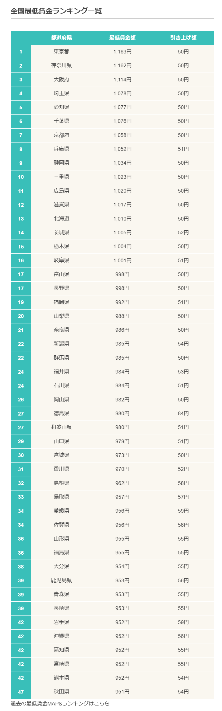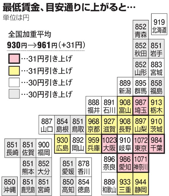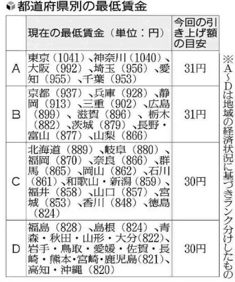按照最新標準,東京、神奈川、大阪、琦玉、愛知、千葉、京都、兵庫、靜岡、三重、廣島、滋賀、北海道、茨城、櫪木、岐阜的最低時薪都超過1,000日元。