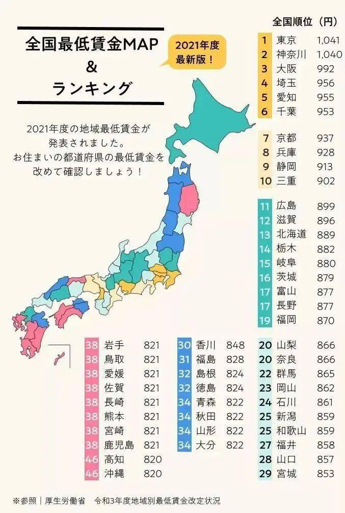 6、2021年10月起,日本47個都道府縣最低小時工資一覽表如下:
